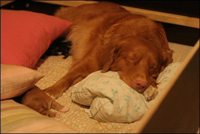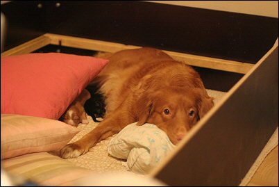 Varovaisesti mennään laatikkoon jos pentuja tyynyjen alla.