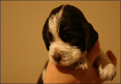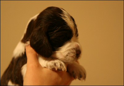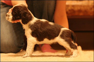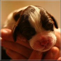 "5 months old bitch. Right size for her age. Feminine head, could have a bit more forehead. Nice eyecolour. Good lenght of neck. Well angul in front. Could have a bit more bone. Nice high on hocks. Puppy movements, who still of course needs to develop. Beautiful coat structure." (Helsinki 10.5.2008, pek- (5))