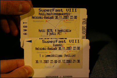 Satamassa tuli olla puoltatoista tuntia ennen laivan lähtöä, laivan oli määrä irrottautua satamasta klo22. Ajoimme vielä kaupan kautta, haettiin pientä iltanaposteltavaa laivalle ja varmuuden vuoksi käteistä jos muovikäteinen sanoisi syystä tai toisesta itsensä irti. Selvityksessä olimme hieman kahdeksan jälkeen ja kukaan ei ollut kiinnostunut koirasta joka katseli maailmaa välissämme. Saatiin kaikille liput kouraan ja siirryttiin seuraavaan paikkaan jonottomaan, tällä kertaa jo laivaan. Kyllähän se hieman jännitti. :) Keräsin laivaan tulevat tavarat yhteen paikkaan, turhat saisi jäädä vuorokauden kestävän laivamatkan ajaksi autoon.