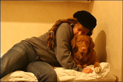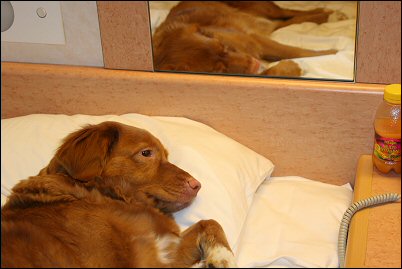 Laivalla kannoin Sannin autokannelta sisätiloihin ettei tassut heti tule ihan öljyisiksi. Tassut kun sai lattiaa vasten, Sanni aloitti villin haistelun ja heilumisen, juma, siis missä ollaan. Portaat juostiin ylös ja hyttikäytävällä vipitettiin vauhdilla. Näki rakkaasta kuinka kivaa oli olla vain mamin ja Jaskan kanssa liikenteessä. :) Hyttimme oli aivan käytävän perällä ja siellä tsekattiin tottakai heti joka nurkka ja sänky oli se Sannin paikka, luonnollisesti. Tuli otettua viltti mukaan ettei lakanat mene ihan sotkuisiksi heti.