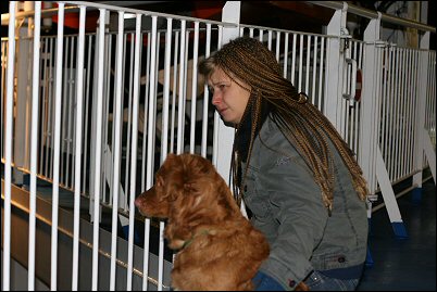 Autolle pääsi vasta kun oltiin aivan satamassa, kannoin Sannin taas öljyisellä kannella. Kukaan ei maissa ollut edelleenkään kiinnostunut koirasta joka notkui välissämme katsellen ihmeissään maailmanmenoa. Eli hyvin saatiin salakuljetettua koira Saksaan. ;)